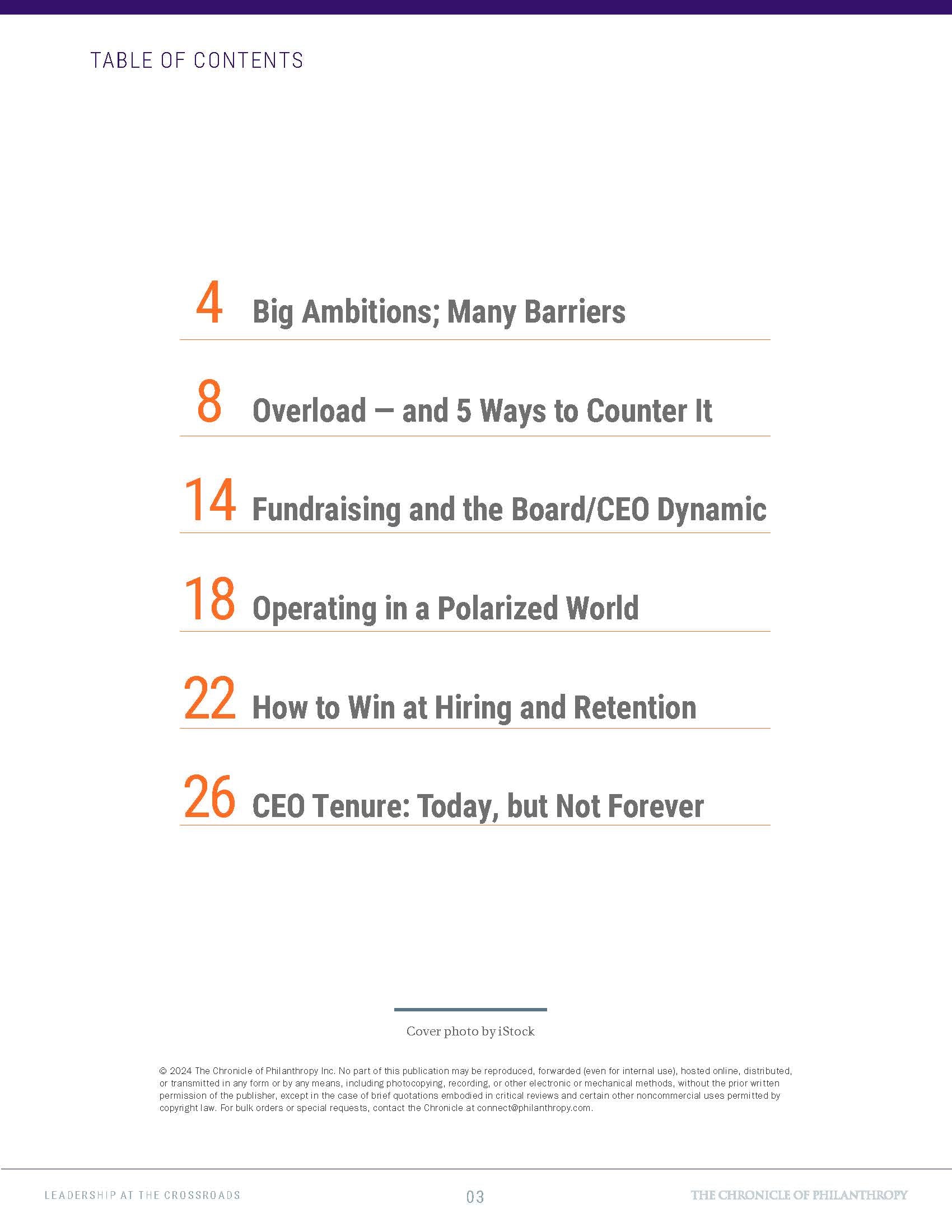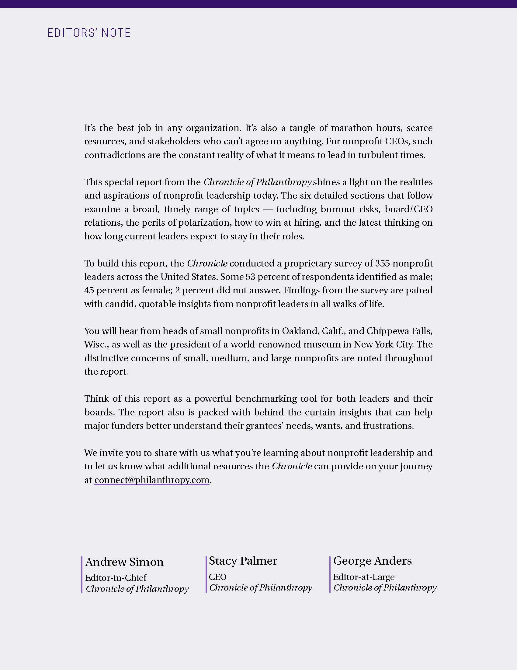 You will learn from a wide cross-section of nonprofit CEOs, presidents, and executive directors. Precise segmenting tools let you see how priorities and resources differ for leaders of small, medium, and large organizations. Throughout the report, leaders’ candid perspectives provide a powerful benchmarking tool for both their peers and their boards. The report also delivers behind-the-curtain insights that can help major funders better understand their grantees’ needs, wants, and frustrations.